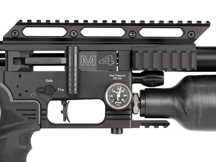 技术说明:虽然手册指出 M4 型号能够承受 300 BAR 的填充压力,但这只有使用售后碳纤维瓶才能实现。步枪上随附的当前 FX 工厂瓶额定填充压力为 250 BAR,不应超过此压力。